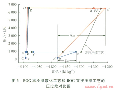 對(duì)比2種工藝的能耗,以氣源型LNG接收站為例進(jìn)行分析,繪制出2種工藝的壓比焓圖(圖3)。