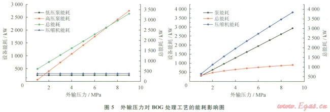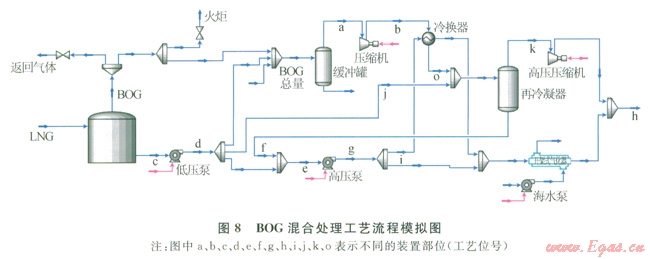 4)BOG進(jìn)入再冷凝器前進(jìn)行預(yù)冷,可在處理相同BOG量時(shí)降低再冷凝器的壓力,從而節(jié)約壓縮機(jī)的能耗,節(jié)約率達(dá)l8.2%。