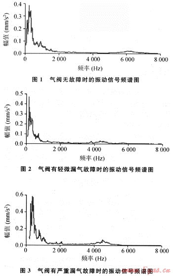 應(yīng)用上述理論方法對壓縮機(jī)氣閥典型故障下振動信號進(jìn)行分析,試驗(yàn)數(shù)據(jù)來源于塔里木油田某壓縮機(jī),采集氣閥各典型故障下振動信號,采樣頻率FS=16000Hz,數(shù)據(jù)長度N=61440,分別采集典型故障信號各5組,每組10個樣本。圖1~3分別為采集到的氣閥無故障、輕微漏氣、嚴(yán)重漏氣故障下的信號頻譜圖(因數(shù)據(jù)較多,僅列出每種典型故障下的1個振動信號樣本的頻譜圖)。
