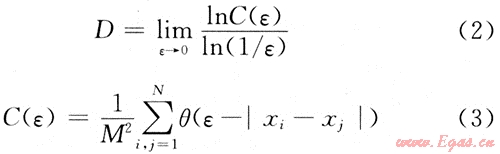 分形維數(shù)有Hausdaorff維數(shù)、相似維數(shù)、容量維數(shù)、信息維數(shù)、關(guān)聯(lián)維數(shù)等幾種形式[10],在機(jī)械設(shè)備故障診斷中一般是計(jì)算信號的關(guān)聯(lián)維數(shù)。若分形集合中某2點(diǎn)之間的距離為ε,其關(guān)聯(lián)函數(shù)為C(ε),則關(guān)聯(lián)維數(shù)為: