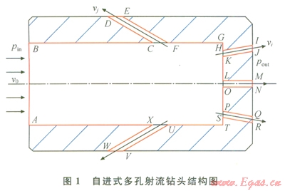 在徑向水平井正常鉆進(jìn)過程中,向后噴射的高速射流從反向孔眼噴出,射流會(huì)從它周圍卷吸流體,由于射流鉆頭前面和四周均為巖石,外界流體補(bǔ)充困難,以至在射流鉆頭后部——環(huán)形區(qū)域形成低壓。由于反向射流是多股均勻分布的,所以在一定條件下可在射流鉆頭后端產(chǎn)生一個(gè)密閉環(huán)境的環(huán)形低壓區(qū)。此區(qū)域壓力低于井底環(huán)境壓力,由于壓差作用,會(huì)對射流鉆頭和高壓軟管產(chǎn)生一個(gè)向前的力,即為反向射流降壓效應(yīng)的自進(jìn)力產(chǎn)生機(jī)理。