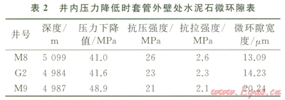 川中地區(qū)高壓天然氣井因Æl77.8mm尾管固井后,采用較低密度鉆井液替換井內(nèi)鉆井液鉆開目的層而使作用在井內(nèi)套管的內(nèi)壓力大幅度降低。該區(qū)塊Æ177.8mm尾管固井時(shí)鉆井液密度約為2.20g/cm3,而下一次開鉆鉆進(jìn)時(shí),鉆井液密度降至1.35g/cm3左右。M8、G2、M9井Æl77.8mm尾管固井,氣層封固質(zhì)量?jī)?yōu)良,候凝過程未發(fā)生氣竄,但井內(nèi)壓力大幅度下降后,喇叭口竄氣。該區(qū)塊水泥石楊氏模量10GPa,泊松比0.19,其余計(jì)算條件及結(jié)果如表2所示。以套管壁處水泥環(huán)徑向拉應(yīng)力達(dá)到抗拉強(qiáng)度為形成微環(huán)隙的臨界條件[7-8],由公式(3),計(jì)算出井內(nèi)壓力下降幅度超過40MPa后,3口井形成寬度l3.09~20.24mm的微環(huán)隙,密封能力顯著降低。