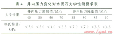 彈性水泥石具備了低楊氏模量、彈性變形能力強(qiáng)的特點(diǎn),能與套管、井壁協(xié)調(diào)變形,有效卸載,大幅度降低微裂隙及微環(huán)隙形成的可能性。由公式(1)、(2)計(jì)算出當(dāng)井內(nèi)壓力變化時(shí),為避免水泥環(huán)破壞,需將水泥石楊氏模量降至適當(dāng)范圍(表4)。以斯倫貝謝為代表的典型彈性水泥石,楊氏模量在3.5~5.5GPa,泊松比約為0.22,抗拉強(qiáng)度在2.2~2.5MPa,在儲(chǔ)氣庫得到成功應(yīng)用,固井質(zhì)量?jī)?yōu)質(zhì),在經(jīng)過試壓及下一次開鉆鉆進(jìn)井內(nèi)壓力變化后,固井質(zhì)量依然良好,未出現(xiàn)氣竄。
