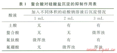 從表l可以看出,氟鈦酸在第一次加入硅酸鈉溶液就產生微渾濁,土酸與氟鈦酸在第二次加入硅酸鈉就產生沉淀,氟硼酸出現(xiàn)少量渾濁,螯合酸在第三次加入硅酸鈉才出現(xiàn)微渾濁,說明螯合酸對硅酸鹽沉淀的抑制性能好。