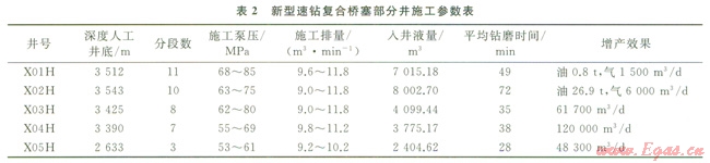 自主研制生產(chǎn)的新型速鉆復合橋塞已成功應用已20余井次,橋塞動作靈活,密封可靠,鉆磨效率高,表2為其中5口井的施工參數(shù),下面針對某一實例井的應用情況進行分析。