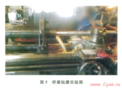 將坐封有新型速鉆復合橋塞的試驗套管固定于專用鉆磨試驗架上,如圖5所示,用Æ73mm螺桿馬達帶專用磨鞋,水泥車泵注清水驅動螺桿馬達,進行了5套橋塞鉆磨實驗,其實驗數(shù)據(jù)如表1所示。