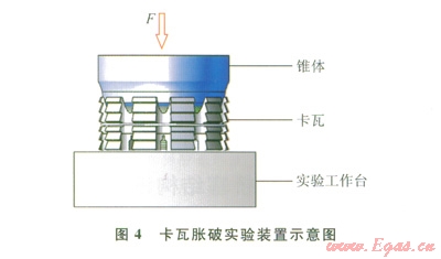 將新型復合橋塞錐體錐入卡瓦,放在拉壓實驗機實驗工作臺上(如圖4所示),拉壓機向錐體緩慢垂直加載直到卡瓦破裂,測試卡瓦破裂所需載荷[8]。經(jīng)反復10次測試實驗,卡瓦沿應力槽破裂,破裂加壓載荷為25~30kN。