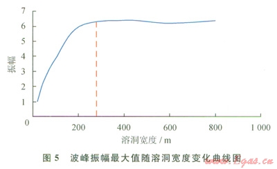 溶洞對(duì)應(yīng)的最大波峰振幅值與溶洞寬度的關(guān)系如圖5所示。當(dāng)溶洞寬度約大于280m后,最大波峰振幅是在逐漸逼近6.5的,此時(shí)振幅值幾乎不再增加,而根據(jù)菲涅爾帶半徑計(jì)算公式可知本次正演模擬菲涅爾帶半徑為280m[8]。由此可見,當(dāng)溶洞寬度小于菲涅爾帶半徑時(shí),溶洞越寬其對(duì)應(yīng)振幅越大;當(dāng)溶洞寬度大于菲涅爾帶半徑時(shí)溶洞寬度對(duì)振幅影響不大。