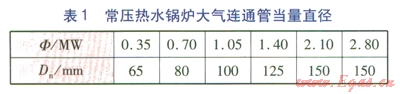 根據(jù)式(1)可計(jì)算出各種規(guī)格的常壓熱水鍋爐必須配備的大氣連通管的當(dāng)量直徑,圓整至公稱直徑,見表l。