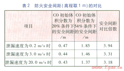 FLUENT軟件雖具有很高的權(quán)威性,但該空間模型還較簡(jiǎn)單。危害氣體源僅考慮CO,忽略其他氣體(如H2)的影響??赏ㄟ^(guò)理論擴(kuò)散計(jì)算對(duì)微量泄漏工況進(jìn)行驗(yàn)證(無(wú)初速度和重力影響)。理論擴(kuò)散計(jì)算得知,對(duì)微量泄漏,2m高程處,C0體積分?jǐn)?shù)達(dá)到0.02%時(shí)7C0初始體積分?jǐn)?shù)為54%的安全間距是初始體積分?jǐn)?shù)為20%的安全間距的1.64倍,該值與其2m高程時(shí)的模擬安全間距對(duì)比倍數(shù)l.65極為接近,故可充分表明軟件模擬的置信性。