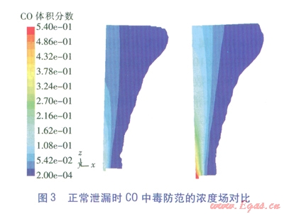 值得一提的是,火災(zāi)防范時(shí)只將爆炸極限列為危害區(qū)間,這符合不發(fā)生明火時(shí)的氣體冷態(tài)擴(kuò)散情況,但一旦發(fā)生燃燒,C0的濃度場(chǎng)將發(fā)生極大變化,還將產(chǎn)生對(duì)人員窒息的煙氣。FLUENT作為一款功能強(qiáng)大的軟件,也能模擬燃燒情況(俗稱熱態(tài)研究),但這將大大增加參數(shù)設(shè)定的復(fù)雜性和計(jì)算過(guò)程冗時(shí)性,這是工程計(jì)算力求避免的,但應(yīng)是理論研究的改進(jìn)方向。