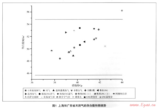 圖1列出了上海與廣東省一些氣源的華白數(shù)和燃燒勢(shì),其整體變化并不大,除LNG富組分外均落在國(guó)標(biāo)12T范圍之內(nèi)(華白數(shù)45.67~54.78MJ/m3,燃燒勢(shì)36.3~69.3,圖1中兩條直線中間的范圍即為國(guó)標(biāo)中12T的華白數(shù)范圍。)。其中最貧的是川氣,最富的是珠海LNG富氣(表1)。若按照95%的CH4純度來配制川氣和珠海LNG(富),即單一氣體CH4含有95%的CH4和5%的C2H6,則配制的川氣和珠海LNG(富)之華白數(shù)將增加,分別為49.22和53.93,偏差為1.73%和1.3%。顯然,若考察不同來源天然氣的組分不同所導(dǎo)致的燃?xì)饩咝阅茏兓?.73%和1.3%的偏差無法滿足實(shí)驗(yàn)要求,必須采用精確的配氣方法。