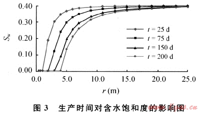 圖3為不同時間含水飽和度隨徑向距離的變化關(guān)系曲線(產(chǎn)量為5×104m3/d)。顯示越靠近井筒水相蒸發(fā)越明顯,在近井區(qū)(距井筒的徑向距離小于5m),儲層含水飽和度甚至可以降低到零,同時隨著生產(chǎn)時間的延長,發(fā)生水相蒸發(fā)區(qū)域逐漸向從井筒向地層擴(kuò)展,但當(dāng)r超過10m之后水相蒸發(fā)引起含水飽和度降低的作用迅速降低。