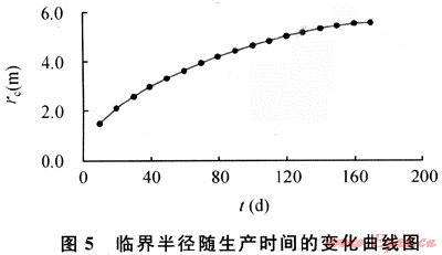 計算的臨界半徑隨時間推移曲線如圖5。表明生產(chǎn)時間越長臨界半徑越大,水相蒸發(fā)的影響范圍越深,但是當(dāng)生產(chǎn)時間超過一定值后(120d),臨界半徑趨于定值,水相蒸發(fā)作用逐漸變緩。