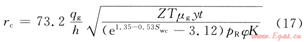 當(dāng)含水飽和度降低到束縛水飽和度時,氣相滲透率達(dá)到最大。定義此時含水飽和度對應(yīng)的徑向距離為臨界半徑,則隨著生產(chǎn)時間的延長和壓力的降低,臨界半徑由井筒附近逐漸向地層伸出推移,對應(yīng)的臨界半徑推移計算公式為: