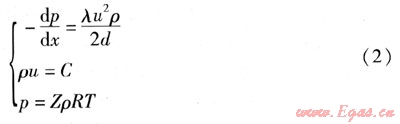 相對于其他項數(shù)值較小,可以忽略[11]。b.在城市燃氣管網(wǎng)中,管道的標高差值不太大,因此,動量方程中的重力項g(ρ-ρa)sinα一般忽略不計。 通過簡化,可以得到仿真數(shù)學(xué)模型,見式(2)。