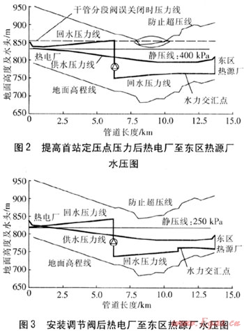 由圖1可見,中繼泵站和熱電廠之間回水壓力有一段高于供水壓力。這是因為中繼泵裝在回水管道上并且揚程較高。中繼泵站位于輸送干線上,中繼泵站和熱電廠之間沒有熱用戶,因此不影響系統(tǒng)正常運行。