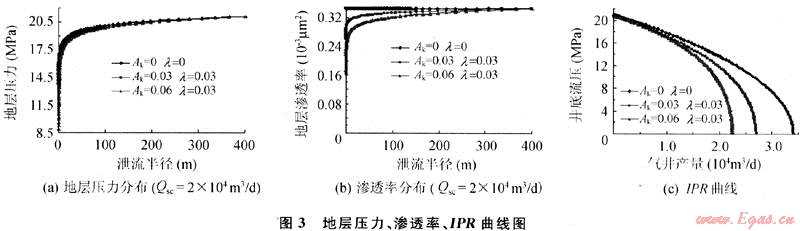 如圖3-b所示,由于上覆巖石壓力基本不變,地層中各點的有效應(yīng)力值不一樣,井筒附近的有效應(yīng)力大,所以其井筒附近的滲透率降低較多,而遠離井筒附近的滲透率降低較少,形成類似于壓力漏斗的“滲透率漏斗”;而不考慮應(yīng)力敏感時,其地層滲透率不變。并且,當(dāng)氣井以2×104m3/d生產(chǎn)時,Ak越大,地層滲透率下降越多。