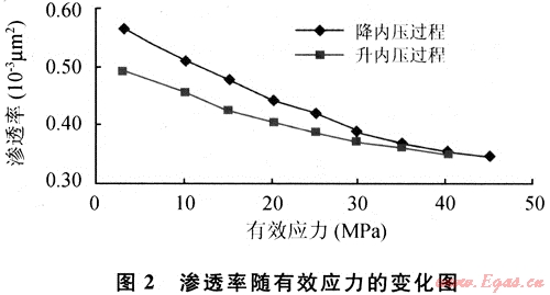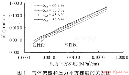 致密低滲透氣藏普遍具有低孔、低滲、束縛水飽和度高的特點,由于細(xì)小孔隙喉道處水化膜的封堵作用,氣體滲流往往具有啟動壓力梯度特征,作用于氣體兩端的壓力梯度要大于啟動壓力梯度才能流動[1];同時許多致密低滲透氣藏具有“應(yīng)力敏感”特征[2]。致密低滲透儲層巖心氣體低速滲流實驗結(jié)果如圖1,在氣體流速和壓力平方梯度的關(guān)系圖上,線性段為達西滲流段,非線性段不通過坐標(biāo)原點,和x軸的交點即為啟動壓力梯度,儲層含水飽和度越高,啟動壓力梯度作用才明顯。致密低滲透氣藏儲層滲透率隨有效應(yīng)力的變化如圖2??梢钥闯鲈诮祪?nèi)壓過程中,滲透率隨有效應(yīng)力的增大而減小,在儲層壓力恢復(fù)的過程,由于儲層發(fā)生了部分塑性變形,滲透率并不能恢復(fù)到初值。