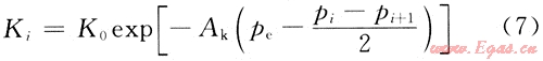 通過巖心應(yīng)力敏感實驗,發(fā)現(xiàn)巖石滲透率與有效應(yīng)力滿足指數(shù)關(guān)系,每一個網(wǎng)格節(jié)點i的滲透率可表征為有效應(yīng)力的函數(shù)[4]: