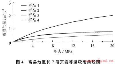 為了解該區(qū)頁巖的吸附能力,在鉆井巖心中采集4個樣品進行等溫吸附試驗,試驗條件為:試驗溫度為35℃(大約相當于1000m埋深的地溫),采用純甲烷在平衡濕度條件進行,試驗結(jié)果為:蘭氏體積為0.98~3.96cm3/g,平均為1.75cm3/g;蘭氏壓力為5.19~19.23MPa,平均為11.89MPa(圖4)。