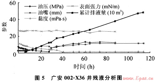 廣安002-X36井施工結(jié)束45min后開(kāi)井排液。壓后自噴返排壓裂液173.7m3后出氣。至2007年9月27日,該井累計(jì)排液530m3,殘液的性能分析見(jiàn)圖5。