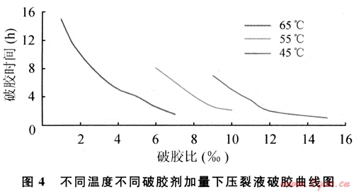 根據(jù)軟件模擬,考察了不同的破膠劑加量在不同溫度下的破膠情況(圖4)。施工過(guò)程中根據(jù)每段壓裂液在地層下滯留的時(shí)間和溫度情況,結(jié)合圖2、4的實(shí)驗(yàn)結(jié)果,設(shè)計(jì)破膠劑追加比例。