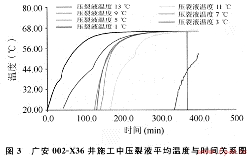 在水力壓裂施工過(guò)程中,由于儲(chǔ)層溫度與地面溫度相差較大,當(dāng)大量具有地面溫度的壓裂液進(jìn)入裂縫中時(shí),在裂縫中溫度有明顯的變化。廣安002-X36井施工設(shè)計(jì)泵注程序見(jiàn)表1。壓裂軟件模擬施工時(shí)各階段壓裂液平均溫度與時(shí)間的關(guān)系見(jiàn)圖3。