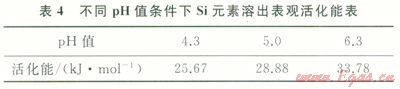 由表4可以看出,Si元素溶出表觀活化能均小于42kJ/mol,表明反應(yīng)為擴(kuò)散控制反應(yīng)[18]。pH值越低,表觀活化能越小,說明pH值越低,Si越容易溶出。由于碳酸酸性較弱,所以,不同pH值下的表觀活化能差別不大。