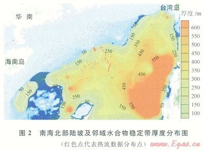 南海北部陸坡區(qū)水深變化范圍介于300~3500m之間,海底溫度介于1.45~9.00℃,而且與水深有很好的相關(guān)性。熱流分布較復(fù)雜(20~170mW/m2)。利用Miles[9]提出的海水中甲烷穩(wěn)定帶邊界曲線方程,以孔隙水鹽度為3.5%,氣體為純甲烷為約束條件,并根據(jù)熱流數(shù)據(jù)、熱導(dǎo)率、水深、海底溫度等參數(shù)進(jìn)行了穩(wěn)定帶厚度估算。計(jì)算結(jié)果表明,南海北部陸坡水合物穩(wěn)定帶厚度介于0~350m,在水深較大海盆區(qū)可超過500m(圖2),在水深小于500m的區(qū)域基本不具備形成水合物的條件。穩(wěn)定域厚度與水深變化呈正相關(guān)關(guān)系,而且水合物穩(wěn)定域受熱流變化驅(qū)動(dòng)明顯,穩(wěn)定域厚度的變化梯度與熱流值變化梯度有很大相關(guān)性,熱流值變小的地方穩(wěn)定域厚度變?nèi)?,呈?fù)相關(guān)關(guān)系。