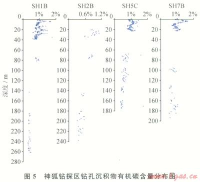 在南海北部陸坡淺表層沉積物有機(jī)質(zhì)中正構(gòu)烷烴基本為雙峰形,表現(xiàn)為海相浮游動(dòng)物、陸源高等植物混合母源特征。神狐鉆孑L沉積物有機(jī)質(zhì)正烷烴為雙峰形分布特征(圖4)。第一主峰碳數(shù)為C17~C19,代表海相浮游動(dòng)物和藻類,第二主峰碳數(shù)為C29或C31來源于陸源高等植物。其輕重?zé)N比值C21-/C22+介于0.06~5.73,有機(jī)質(zhì)d13C值為-17.3‰~-22.8‰,表明總體上以海相浮游動(dòng)物和藻類為主,局部存在陸源有機(jī)質(zhì)。鉆孔沉積物TOC介于0.29%~1.77%,各鉆孔頂部層段TOC明顯表現(xiàn)出在高值區(qū)振蕩變化特征,并隨深度的增加TOC值逐漸降低,而到一定深度后,TOC基本保持穩(wěn)定(圖5)。這種有機(jī)碳系統(tǒng)地向下減少是早期成巖階段有機(jī)質(zhì)氧化分解的結(jié)果[17]。由于鉆孔淺部沉積物埋藏時(shí)間短,有機(jī)質(zhì)消耗較少,TOC與沉積物中原始含量比較接近,平均值達(dá)1.2%;而下部層段的有機(jī)碳為經(jīng)過早期成巖階段硫酸鹽還原和微生物發(fā)酵而大量消耗后的穩(wěn)定殘留有機(jī)碳,有機(jī)碳轉(zhuǎn)化率在30%~61%,大多轉(zhuǎn)化為生物甲烷氣,是形成水合物的主要?dú)怏w來源。神狐鉆孔沉積物有機(jī)質(zhì)中含有豐富的烷基苯系列化合物,以短鏈的烷基苯同系物優(yōu)勢(shì)為特征,含少量對(duì)熱演化敏感的較長(zhǎng)鏈的烷基苯同系物,表明有機(jī)質(zhì)熱演化程度很低。此外,部分樣品中存在重排甾烷和4-甲基甾烷,是典型的微生物作用活動(dòng)標(biāo)志,這與鉆探證實(shí)的水合物主要為微生物氣特征是一致的。