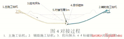 對(duì)接穿越需要在穿越曲線入、出土點(diǎn)兩端各架設(shè)一臺(tái)鉆機(jī),在鉆桿短節(jié)內(nèi)內(nèi)安置感應(yīng)探頭與目標(biāo)磁鐵,兩臺(tái)鉆機(jī)分別進(jìn)行導(dǎo)向孔頂進(jìn),當(dāng)兩臺(tái)鉆機(jī)的鉆頭鉆至預(yù)定對(duì)接點(diǎn),并且兩鉆頭距離在探測(cè)范圍內(nèi)時(shí),由入土點(diǎn)鉆機(jī)的探頭感應(yīng)出土點(diǎn)鉆機(jī)鉆頭安裝的目標(biāo)磁鐵發(fā)出的磁信號(hào),兩臺(tái)鉆機(jī)械調(diào)操作,入土點(diǎn)鉆機(jī)鉆機(jī),出土點(diǎn)鉆機(jī)回抽鉆桿,直至兩臺(tái)鉆機(jī)的導(dǎo)向孔完全吻合(如圖1)