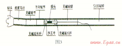 本次采用有線控向系統(tǒng),井下鉆具組合主要由鉆頭、帶彎外殼的螺桿馬達(dá)、泥漿壓力傳感器、控向探棒(兩端帶扶正器)和無磁鉆鋌組成,其中控向探棒安裝在無磁鉆鋌內(nèi)部。如圖3: