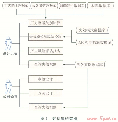 系統(tǒng)的設(shè)備工藝描述、設(shè)計(jì)參數(shù)、介質(zhì)特性、材料等基礎(chǔ)數(shù)據(jù)庫用于設(shè)計(jì)人員進(jìn)行壓力容器類別的計(jì)算,然后從失效模式數(shù)據(jù)庫、風(fēng)險(xiǎn)措施數(shù)據(jù)庫調(diào)用數(shù)據(jù)開展失效模式和風(fēng)險(xiǎn)控制判別,參照失效案例,產(chǎn)生壓力容器設(shè)計(jì)階段的風(fēng)險(xiǎn)評(píng)估報(bào)告,提交公司主管領(lǐng)導(dǎo)審核。上級(jí)公司主管領(lǐng)導(dǎo)在系統(tǒng)中進(jìn)行審核,必要時(shí)也能方便地調(diào)用失效案例數(shù)據(jù)進(jìn)行復(fù)核(圖1)。