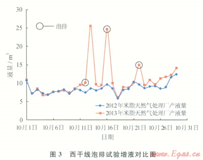 整理子洲氣田天然氣處理廠2012和2013年1—10月西干線產(chǎn)液數(shù)據(jù)進(jìn)行對(duì)比分析(圖3),泡排措施之前下游天然氣處理廠液量變化較小,增液指標(biāo)在較小幅度內(nèi)正常波動(dòng),在泡排期產(chǎn)液量均有所增加,部分時(shí)段泡排后立即見效,部分時(shí)間發(fā)生在泡排后的1~2天內(nèi),分析認(rèn)為與泡排區(qū)段內(nèi)管線的氣量波動(dòng)、積液狀況等相關(guān)。