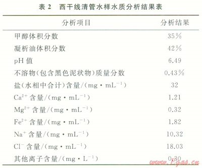 目前國(guó)內(nèi)外所使用的泡沫劑為了減少礦化度、溫度對(duì)其排液效果的影響,基本上采用陰離子表面活性劑[17],由于西干線管線積液(表2)中有大量的甲醇和凝析油,其為擴(kuò)散能力很強(qiáng)的低分子量物質(zhì),它的存在將加快泡排劑泡沫表面的排液速度,使得泡排劑產(chǎn)生的泡沫極不穩(wěn)定,很容易破滅。為此,對(duì)管線泡沫排水劑配方研究從以下兩方面進(jìn)行:①為了消除甲醇對(duì)發(fā)泡劑泡沫穩(wěn)定性的影響,對(duì)活性劑進(jìn)行篩選,選用泡沫壁相對(duì)較厚且泡沫形狀呈菱形穩(wěn)定結(jié)構(gòu)的活性劑作為泡沫排水劑的發(fā)泡成分,并且加入增溶劑,以增大活性劑在配方中的溶解度,使得配方中有效發(fā)泡成分大大增加,以消除抗凍劑對(duì)泡沫排水劑發(fā)泡、帶液能力的影響;②在發(fā)泡劑分子上引入羧基基團(tuán),讓這種網(wǎng)狀基團(tuán)阻礙或減慢甲醇這類擴(kuò)散劑分子侵入發(fā)泡劑泡沫表面,減慢或消除甲醇對(duì)發(fā)泡劑泡沫排液的影響。取西干線清管的水樣,通過系列室內(nèi)實(shí)驗(yàn),研制出管道高抗醇、抗油的管道泡排劑UT-14,3種活性劑(a:油患子精華素;b:聚乙二醇;c:三乙醇胺)的最佳配制比例為:a:b:c=10:4:1,其發(fā)泡能力(泡沫高度)達(dá)到150mm,5min后也能保持在120mm。參照泡排劑評(píng)價(jià)相關(guān)標(biāo)準(zhǔn),開展常規(guī)泡排劑與新研制泡排劑UT-14對(duì)比實(shí)驗(yàn),實(shí)驗(yàn)結(jié)果見表3,由此叮以看出,管道泡排劑UT-14抗醇、抗油能力較好,現(xiàn)場(chǎng)使用濃度(體積分?jǐn)?shù))為3.00‰~5.00‰,該濃度泡排劑加注后不會(huì)對(duì)下游分離沒備、管線造成影響。