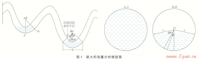 式中Vi為單段下凹管道積液量,m3;a為管道橫截面液面最大圓心角度,(°);i為某個(gè)下凹段管線積液段處最大圓心角度;S為管道橫截面液相面積,m2;L為某個(gè)下凹段管線積液段處弧長(zhǎng),m;q為管道橫截面液面圓心角;ri為管道橫截面圓半徑,m;a為某個(gè)下凹段管線積液段處圓心角。