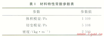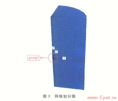 圖3中,1/4圓柱體模擬儲(chǔ)氣庫(kù)溶腔周圍的地質(zhì)環(huán)境,其直徑是儲(chǔ)氣庫(kù)溶腔模型最大直徑的20倍,在網(wǎng)格中間位置可以看到儲(chǔ)氣庫(kù)溶腔輪廓的1/4。在網(wǎng)格劃分時(shí)將儲(chǔ)氣庫(kù)溶腔網(wǎng)格一起劃分,有助于儲(chǔ)氣庫(kù)溶腔的形成。在此網(wǎng)格中,定義了2個(gè)組,分別是group1和group2,前者對(duì)儲(chǔ)氣庫(kù)溶腔進(jìn)行網(wǎng)格劃分,后者對(duì)儲(chǔ)氣庫(kù)溶腔周圍地質(zhì)環(huán)境進(jìn)行網(wǎng)格劃分。選擇采用各向同性彈性模型,其材料特性常數(shù)見(jiàn)表1。
