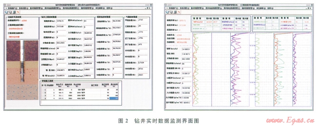 3)建立了以國際通用WITS標準為參考依據(jù)的鉆井風險控制系統(tǒng)數(shù)據(jù)庫,并優(yōu)化了數(shù)據(jù)庫結構及查詢模式,開發(fā)了鉆井風險控制系統(tǒng)實時數(shù)據(jù)庫管理軟件。軟件為用戶提供了數(shù)據(jù)庫備份、數(shù)據(jù)庫還原功能;可以瀏覽、修改、查詢、導出、導入、刪除、整理任意井的鉆井數(shù)據(jù);可以對各種數(shù)據(jù)進行實時顯示、按時間回放、按井深回放;可以將任意數(shù)據(jù)導出到文本文件中;可以進行異地備份;可以按用戶需要導入相關數(shù)據(jù),鉆井實時數(shù)據(jù)監(jiān)測界面如圖2所示。