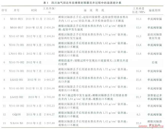 統(tǒng)計川渝地區(qū)近年在裸眼封隔器完井作業(yè)時共發(fā)生溢流有14井次(表1)。表中反映了溢流多發(fā)牛在采用KC1完井液替換裸眼段鉆井液和坐封管柱丟手后用清水替出井內鉆井液2種工況。