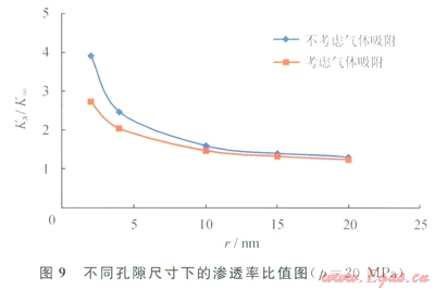 考慮氣體滑脫之后,表觀氣體滲透率可以通過式(6)計(jì)算,其中的孔隙半徑隨著壓力的變化而變化,結(jié)合式(6)、式(8),分別計(jì)算不考慮及考慮氣體吸附的表觀滲透率。圖8為直徑為10nm的納米孔隙,不同的壓力之下是否考慮氣體吸附的表觀滲透率變化曲線。圖9為壓力為20MPa時(shí),不同尺寸的納米孔隙是否考慮氣體吸附的表觀滲透率變化曲線。