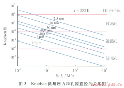 Knudsen數(shù)是判斷氣體在不同尺度的流動(dòng)通道內(nèi)的流動(dòng)是否存在滑脫效應(yīng)的無量綱數(shù),代表了分子的平均自由程同孔隙尺寸的相互比例關(guān)系,是識別氣體不同流動(dòng)狀態(tài)的重要參數(shù),其數(shù)學(xué)表達(dá)式為[30]:
