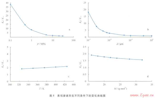 根據(jù)式(6)可知,溫度、壓力、孔隙半徑等因素均對氣體滑脫存在影響,采用Javadpour模型分析以上不同因素對頁巖納米孔隙氣體滑脫的影響程度(圖5)。圖5-a是溫度為353K的條件下,甲烷氣在10nm的孔隙中流動(dòng)時(shí),表觀滲透率隨著壓力的變化曲線;圖5-b是溫度為353K、壓力5MPa的條件下,甲烷氣在不同半徑的孔隙中流動(dòng)時(shí),表觀滲透率隨著壓力的變化曲線;圖5-c是壓力為5MPa,甲烷氣在孔隙半徑為10nm的孔隙中流動(dòng)時(shí),表觀滲透率隨著溫度的變化曲線;圖5-d為壓力為5MPa,溫度為353K,摩爾質(zhì)量不同的氣體在孔隙半徑為10nm的孔隙中流動(dòng)時(shí),靜觀滲透率隨著溫度的變化曲線。