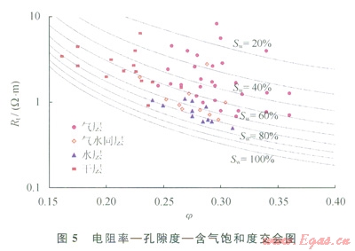 式(6)、(7)分別為孔隙結構指數(m)和飽和度指數(n)的計算公式,利用修正的阿爾奇公式計算Sw,并建立電阻率孔隙度 含氣飽和度交會圖,能夠較好地識別氣水層(圖5)。