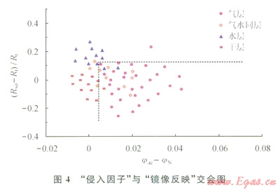 結合基于淡水鉆井液侵入特征分析以及聲波孔隙度和中子孔隙度的“鏡像反映”特征。通過引入“侵入因子”[(Rxo-Rt)/Rt],其中Rxo、Rt分別為中、深感應測井值,建立“侵入因子”與“鏡像反映”(jac-jN)的交會圖,可以有效地識別氣水層(圖4)。