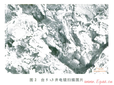 黏土礦物中以蒙脫石、伊蒙混層礦物以及伊利石的附加導電作用最為顯著,當吸附陽離子的數量(即巖石表面的陽離子交換容量)較大時,吸附陽離子的附加導電作用非常顯著,可以使氣層電阻率明顯降低,甚至形成低阻氣層[7-10]。根據掃描電鏡資料(圖2),臺南氣田儲層中可分別識別出蒙脫石、伊一蒙混層、伊利石、高嶺石、綠泥石以及少量綠蒙混層等自生黏土礦物,它們分布于粒表或粒間。通過統(tǒng)計臺5-x3、臺6-x8、臺試x5等3口井各層位的黏土礦物相對含最發(fā)現(xiàn),臺6-x8蒙皂石平均含量11.9%,伊利石43%,臺試x5和臺5-x3井不含蒙皂石,但伊利石和伊/蒙混層均比較高,臺試x5井伊/蒙混層含量高達43.8%,伊/蒙混層和伊利石平均含量在54%以上,可能存在黏土附加導電作用。
