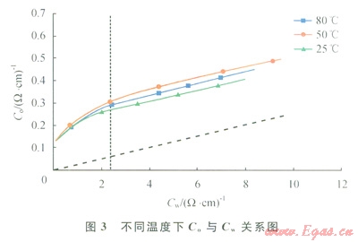 圖3中虛斜線為純水砂巖在25℃實驗條件下的關系曲線,從圖3中可以看出,在淡的平衡溶液部分(Cw在0~2.5之間),泥質砂巖的電導率(Co)將隨溶液電導率(Cw)的增加急劇增大,Co增加的速度遠大于Cw增加的速度,當溶液電導率(Cw)進一步增加的時候,泥質砂巖的電導率(Co)將隨溶液電導率(Cw)的增加呈線性增加,即當溶液電導率(Cw)大于2.5(W·cm)-1時,此時Co—Cw的曲線呈線性關系。根據W&S模型,在常溫(25℃)下,當溶液礦化度超過一定濃度時,陽離子附加電導B值將趨于一個非常有限的極值。礦化度越高,水溶液電導率(Cw)就越大,附加電導分量(BQv)與溶液電導(Cw)相比對總的電導貢獻就越小。因此當地層水礦化度很高時,黏土附加電導作用是完全可以忽略的。