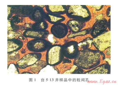 微觀孔隙的大小及其分布特征決定了束縛水飽和度的高低,同時,由于親水性強的黏土礦物的填充進一步改造了粒間孔隙,造成微孔隙的增加,巖石內比面的增大,薄膜滯水增多,含水飽和度增加。臺南氣田儲層孔隙類以原生孔隙為主,僅有少量的次生孔隙。原生孔隙主要為原生粒間孔,其次為雜基內微孔;次生孔隙主要為溶孔,有少量裂縫發(fā)育。通過臺5-x3及臺試x5井鑄體薄片(圖1)對孔隙類型的統(tǒng)計表明,發(fā)現(xiàn)孔隙結構中84.78%為粒間孔,13.04%為微裂縫;喉道類型以縮頸型喉道為主,少量微喉道,孔徑分布一般在0.1~1mm之間,面孔率在1%~15%之間。分析表明,臺試5井孔隙以粒間孔為主,孔隙半徑比較細,微孔隙比較發(fā)育,發(fā)育少量微裂縫。
