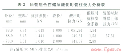 根據(jù)抗管柱在酸壓、生產(chǎn)過程中的強度校核,最大限度地降低生產(chǎn)成本,油管柱選擇125鋼級Æ88.9mm×7.34mm+Æ88.9mm×6.45mm+Æ73mm×5.51mm復合油管。
