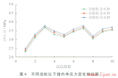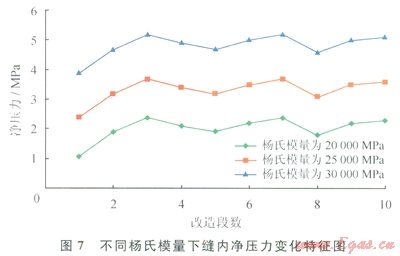 為進一步研究儲層巖石力學(xué)參數(shù)對應(yīng)力陰影的影響,設(shè)置不同泊松比和楊氏模量進行研究。考察泊松0.2、0.35、0.45比時,結(jié)果表明泊松比對應(yīng)力陰影的影響較小,即便在泊松比為0.5的極端情況下,導(dǎo)致的凈壓力變化幅度仍不大,因此產(chǎn)生的應(yīng)力影響很小(圖6)??疾鞐钍夏A?span lang="EN-US">20000MPa、25000MPa、30000MPa等3種情況,研究表明:楊氏模量對裂縫內(nèi)凈壓力值的變化影響較大,產(chǎn)生的應(yīng)力陰影現(xiàn)象越強烈,楊氏模量越高對裂縫應(yīng)力陰影效果影響也較大(圖7)。因此,儲層巖石力學(xué)參數(shù)中楊氏模量對應(yīng)力陰影現(xiàn)象的影響最敏感。